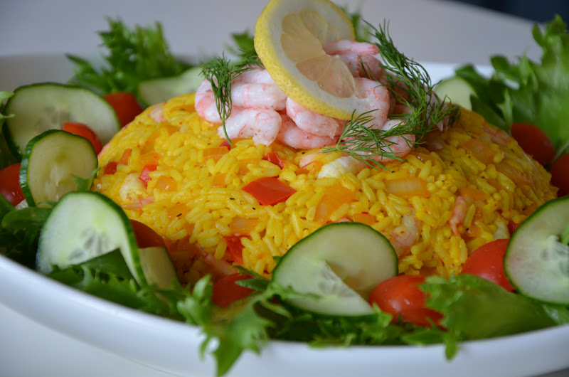 Börja med att skala räkorna. Koka ris med vatten och lite salt enligt anvisningar, eller tills vattnet kokat bort. Hacka lök och paprika och stek det mjukt i smör tillsammans med saffran. Jag hade inte i vitlök men tror det skulle ha blivit riktigt gott och testar nog det nästa gång. När riset är klart blandas det ner i lök och paprikafräset. Vänd runt noga så allt ris färgas gult. Tillsätt ev lite vatten om det verkar klibba ihop. Smaka av med salt, peppar och en gnutta cayenne. Spara några räkor till dekoration och vänd ner resten. Skölj en kakform med kallt vatten och packa riset i den. Vänd upp på ett stort fat och dekorera med salladsblad, körsbärstomater och gurka runt kanten. Dekorera riset med räkor, citron och dill. Servera med kall örtsås och gott bröd.